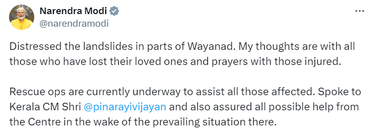 पीएम नरेंद्र मोदी ने ट्वीट किया, “वायनाड के कुछ हिस्सों में भूस्खलन से व्यथित। मेरी संवेदनाएं उन सभी लोगों के साथ हैं जिन्होंने अपने प्रियजनों को खोया है और जो घायल हुए हैं उनके लिए प्रार्थना करता हूं। सभी प्रभावित लोगों की सहायता के लिए बचाव अभियान फिलहाल चल रहा है। केरल के सीएम पिनाराई विजयन से बात की और वहां की मौजूदा स्थिति के मद्देनजर केंद्र की ओर से हर संभव मदद का आश्वासन भी दिया।”
