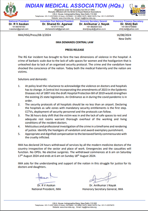 IMA ने देश के सभी आधुनिक चिकित्सा डॉक्टरों द्वारा 24 घंटे के लिए सेवाएं बंद करने की घोषणा की है, चाहे वे किसी भी क्षेत्र और कार्यस्थल पर काम करते हों। आपातकालीन और दुर्घटना संबंधी सेवाएं जारी रहेंगी। कोई ओपीडी नहीं होगी। कोई वैकल्पिक सर्जरी नहीं होगी। यह शनिवार 17 अगस्त 2024 को सुबह 6 बजे शुरू होगी और रविवार 18 अगस्त 2024 को सुबह 6 बजे समाप्त होगी।