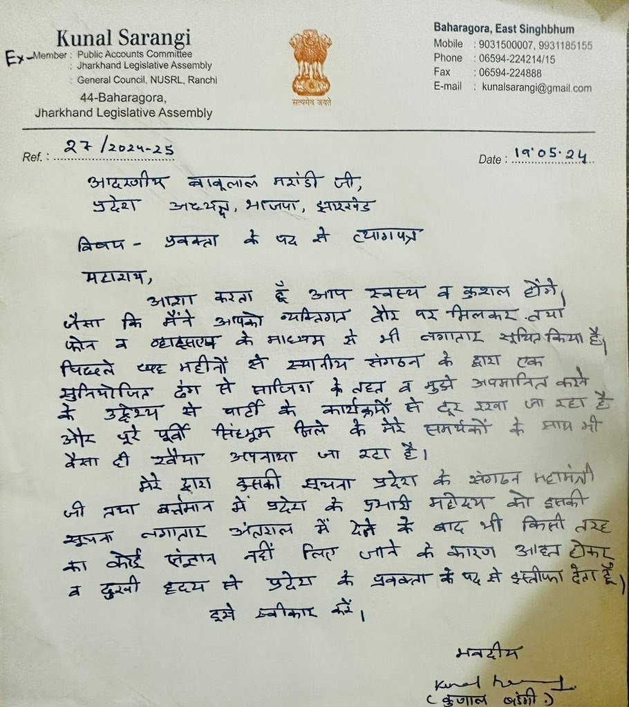 पार्टी अध्यक्ष बाबूलाल मरांडी को लिखे गये पत्र में कुणाल सारंगी ने अपनी पीड़ा बताते हुए लिखा कि मैने आपको व्यक्तिगत तौर पर मिलकर तथा फोन और वॉट्सअप के माध्यम से लगातार सूचित किया कि पिछले 6 महीनों से स्थानीय संगठन द्वारा सुनियोजित ढंग से साजिश के तहत मुझे अपमानित करने के उद्देश्य से पार्टी के कार्यक्रमों से दूर रखा जा रहा है और पूर्वी सिंहभूम जिले में मेरे समर्थकों के साथ भी वैसा ही रवैया अपनाया जा रहा है।