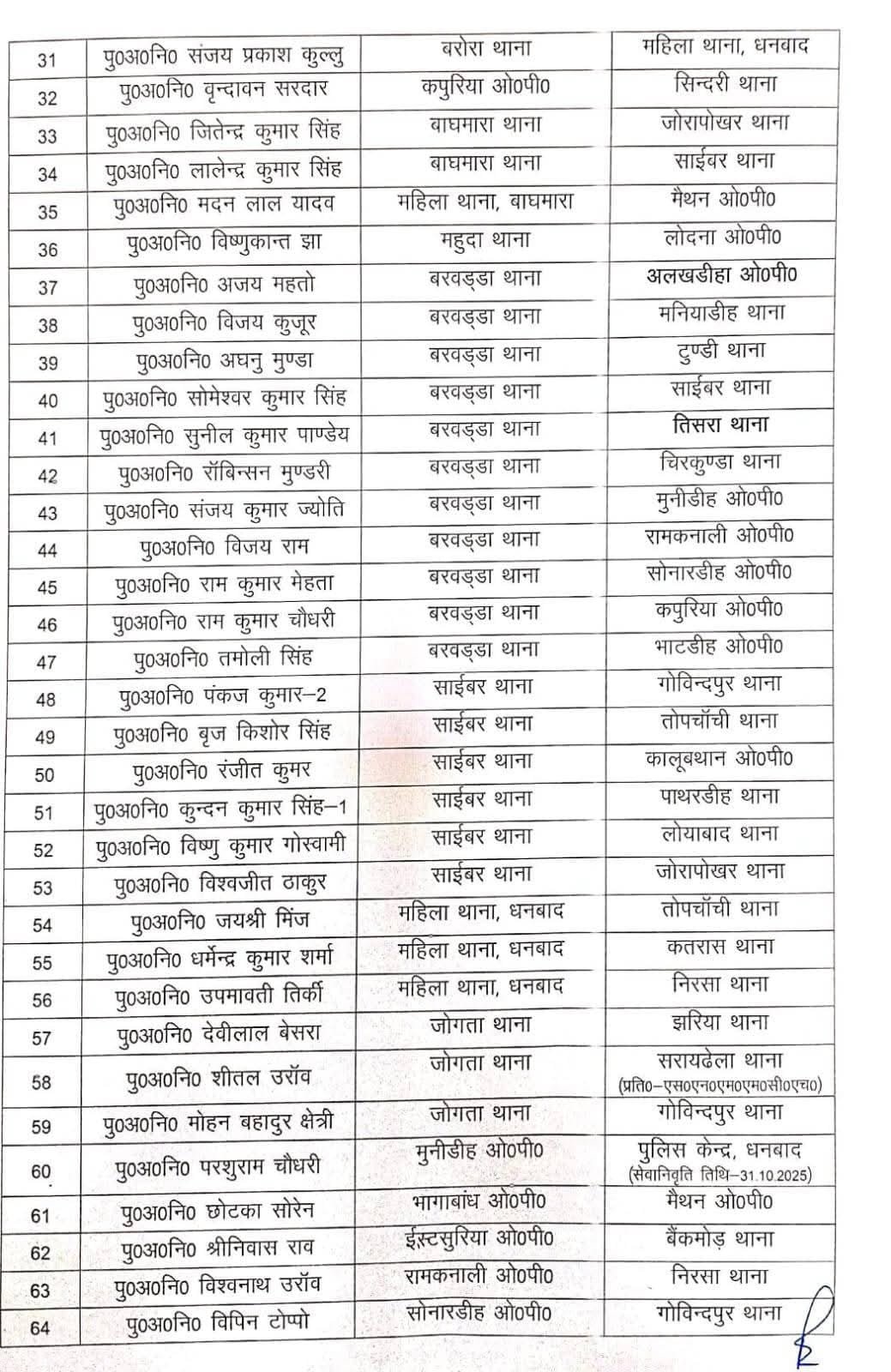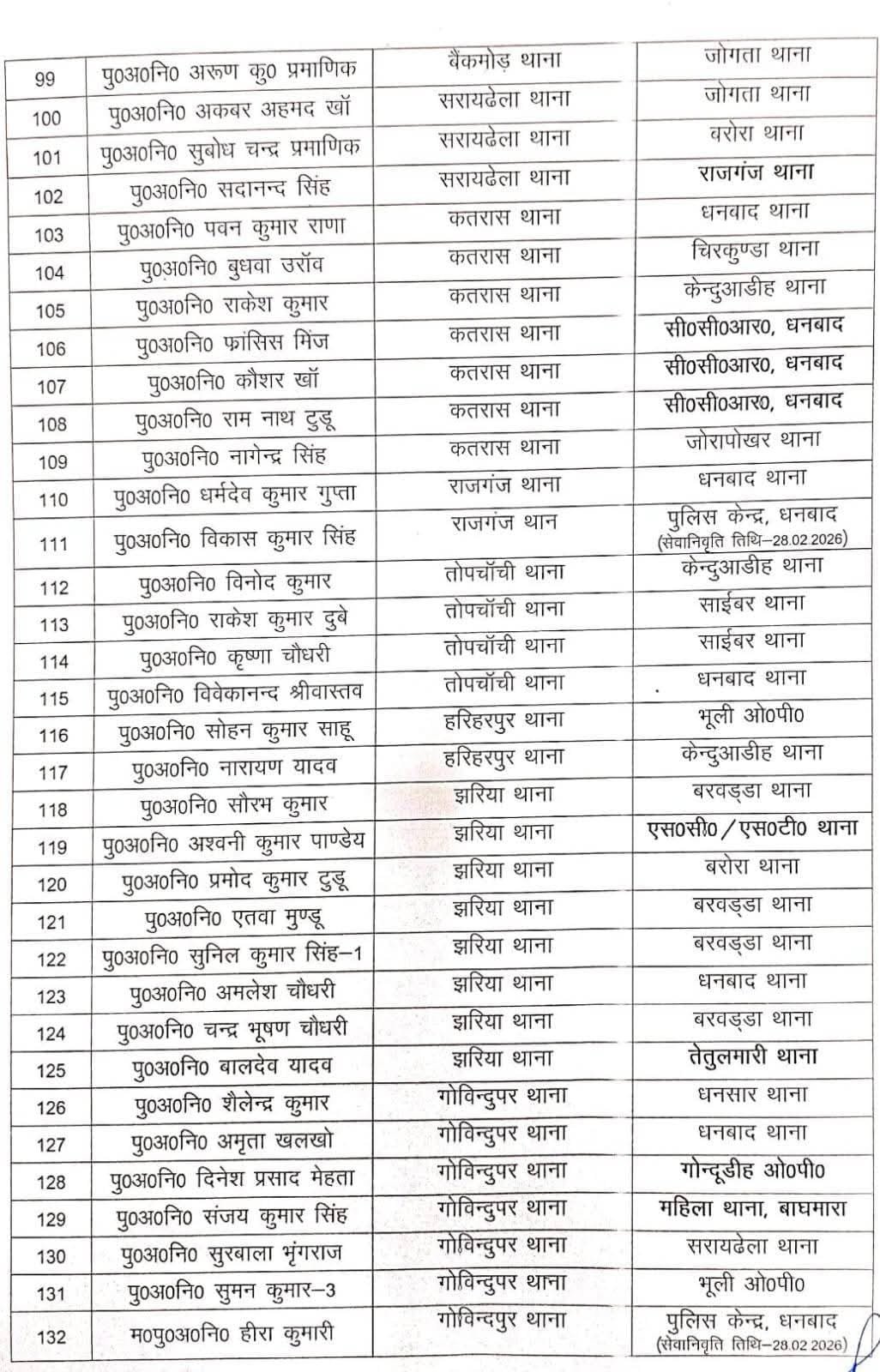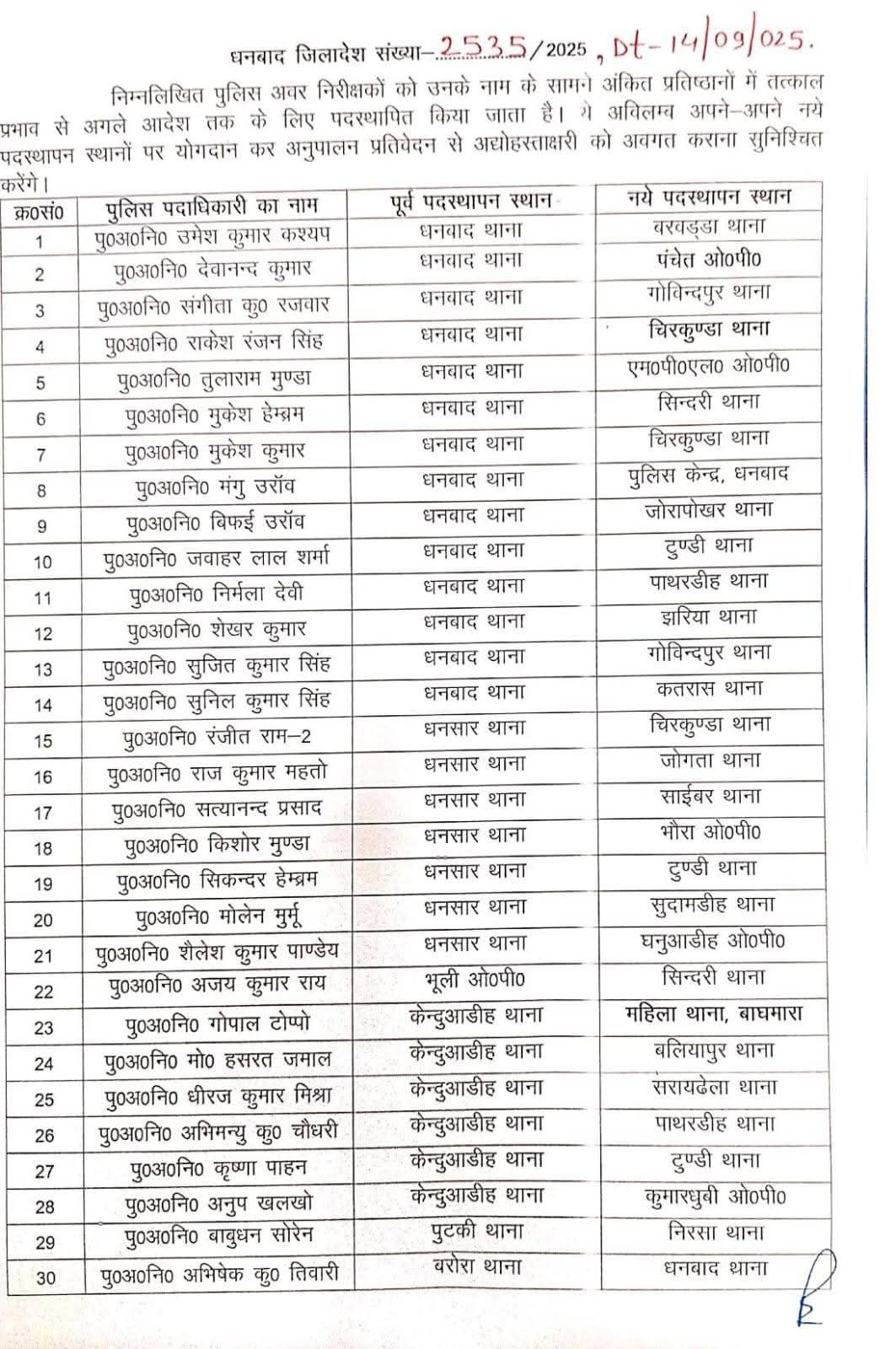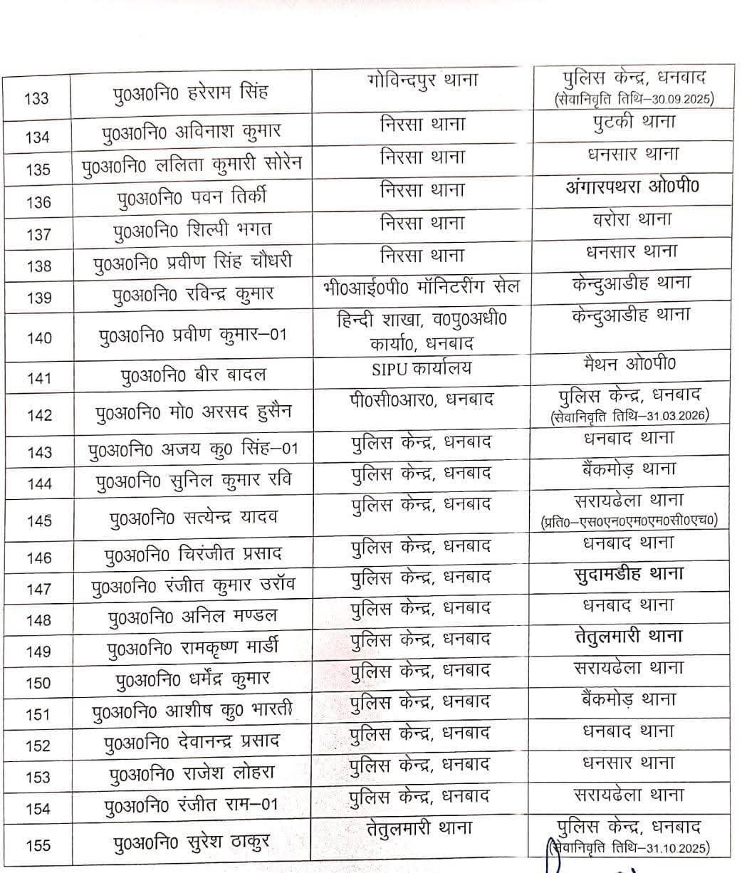 धनबादः जिले के एसएसपी प्रभात कुमार ने बड़े पैमाने पर जिला में पुलिस पदाधिकारियों का तबादला किया है। जिले के 155 पुलिस अवर निरीक्षकों का ट्रांसफर किया गया है। माना जा रहा है कि दुर्गा पूजा से पहले कानून-व्यवस्था को दुरूस्त करने के लिए भारी पैमाने में ट्रांसफर पोस्टिंग की गई है।