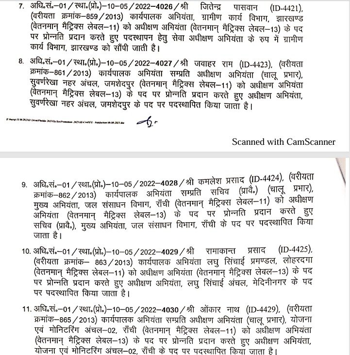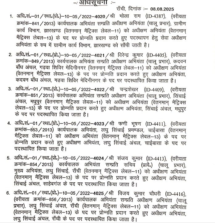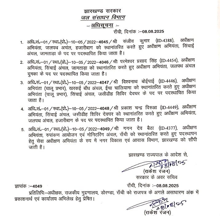 रांचीः झारखंड में जल संसाधन विभाग में बड़े पैमाने पर तबादले किये गए है। विभाग की ओर से इसको लेकर अधिसूचना जारी की गई है।