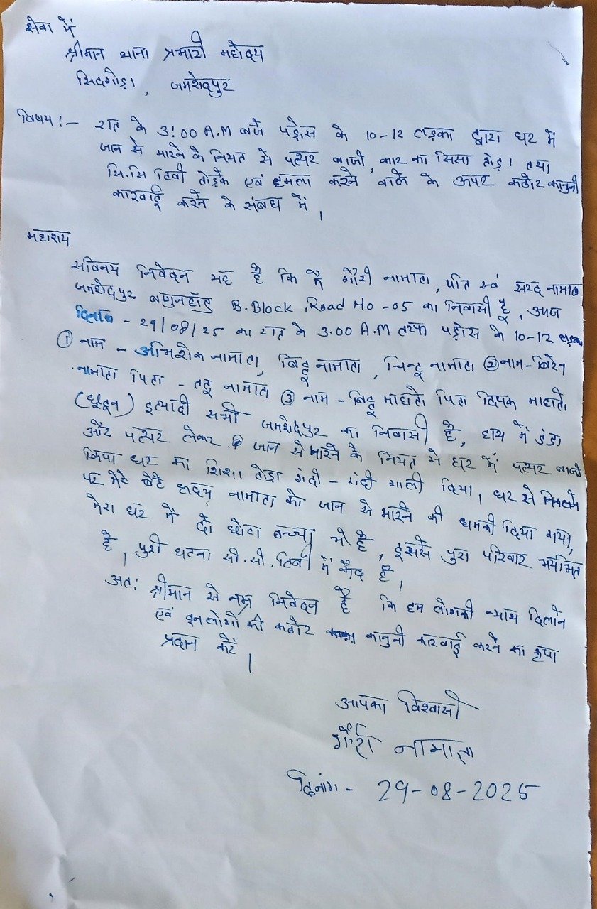 बागुनहातू बी ब्लॉक रोड़ नंबर-5 की रहने वाली गौरी नामाता ने सिदगोड़ा थाना में इसको लेकर शिकायत दर्ज कराई है। उन्होने थाना जो शिकायत शुक्रवार की सुबह दर्ज कराई है उसमें कहा गया कि सुबह करीब 3 बजे पड़ोस के 10 से 12 लड़कों ने उनके घर पर हमला कर दिया। हाथ में डंडा और पत्थर लेकर जान से मारने की नीयत से घर पर पत्थर फेंके गए। गंदी-गंदी गाली दिया गया। घर से निकलने पर उनके बेटे ह्रदय नामाता को जान से मारने की धमकी दी गई। उन्होने लिखा है कि उनके घर में दो छोटे-छोटे बच्चे है और इस घटना के बाद पूरा परिवार दहशत में है।
