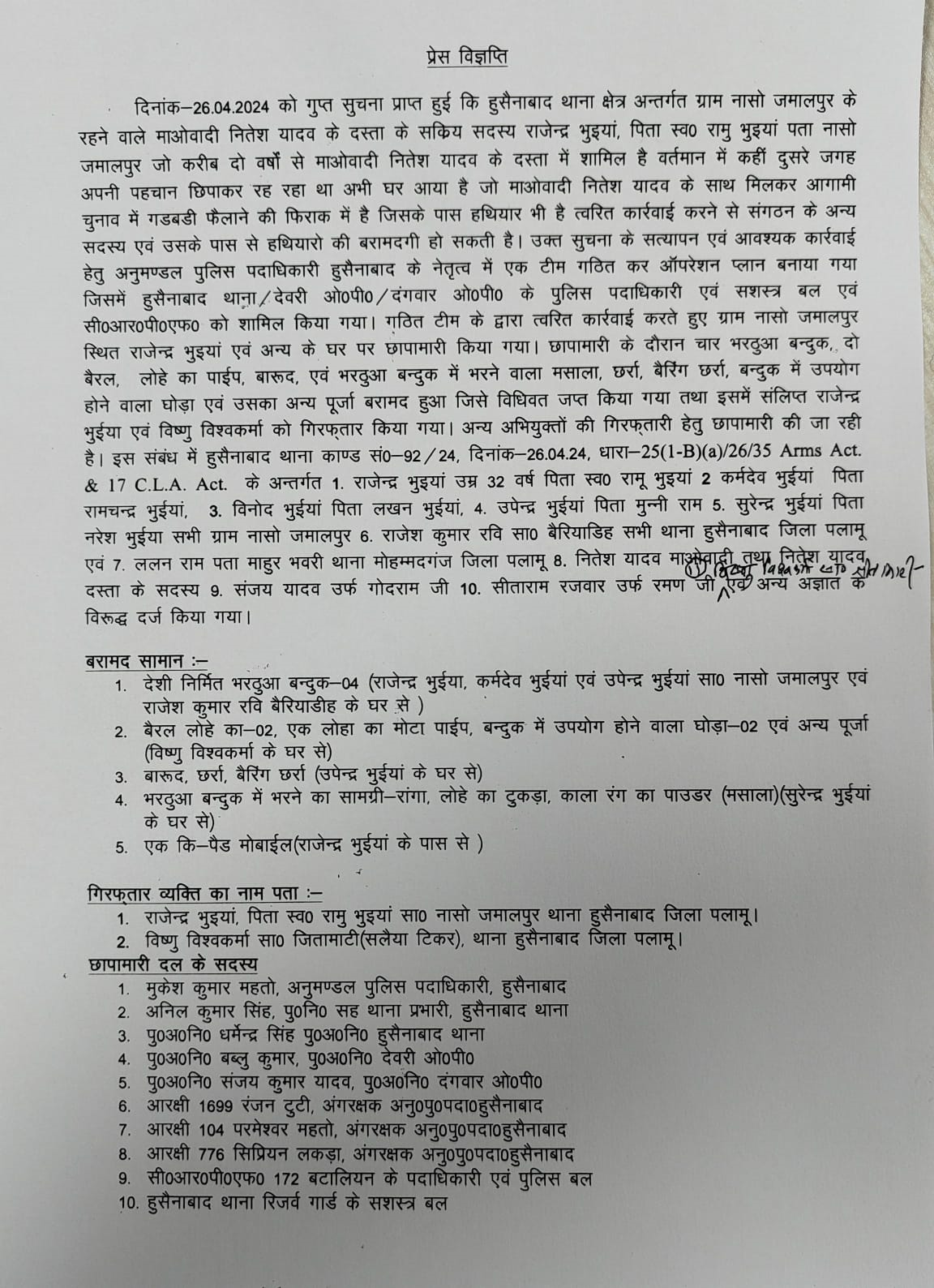 पलामू एसपी ने गुप्त सूचना के आधार पर मिली जानकारी के आधार पर हुसैनाबाद अनुमंडल पदाधिकारी मुकेश कुमार महतो ने नेतृत्व में एक टीम का गठन किया। इस टीम ने हुसैनाबाद थाना क्षेत्र के जमालपुर के रहने वाले नितेश यादव के दस्ते के दो सदस्य राजेश भुईयां और विष्णु विश्वकर्मा को हथियार के साथ गिरफ्तार किया।