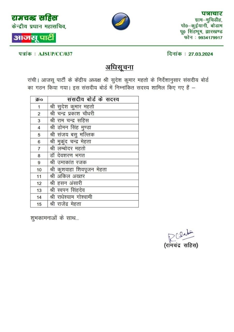 रांची : आजसू पार्टी के केंद्रीय अध्यक्ष सुदेश महतो ने पार्टी के संसदीय बोर्ड का गठन बुधवार को किया। इसमें सुदेश महतो के अलावा 15 सदस्यों को रखा गया है। पार्टी के उपाध्यक्ष और सांसद चंद्र प्रकाश चौधरी, पूर्व मंत्री रामचंद्र सहिस समेत 15 नेताओं को संसदीय बोर्ड में जगह दी गई है। गुरूवार को रांची स्थित पार्टी मुख्यालय में पार्टी के संसदीय बोर्ड की बैठक होगी जिसमें गिरिडीह लोकसभा क्षेत्र में उम्मीदवार को लेकर फैसला लिया जाएगा। माना जा रहा है कि एक बार फिर चंद्र प्रकाश चौधरी को पार्टी गिरिडीह से उम्मीदवार बनाएगी जिसपर संसदीय बोर्ड की बैठक में मुहर लगेगी।