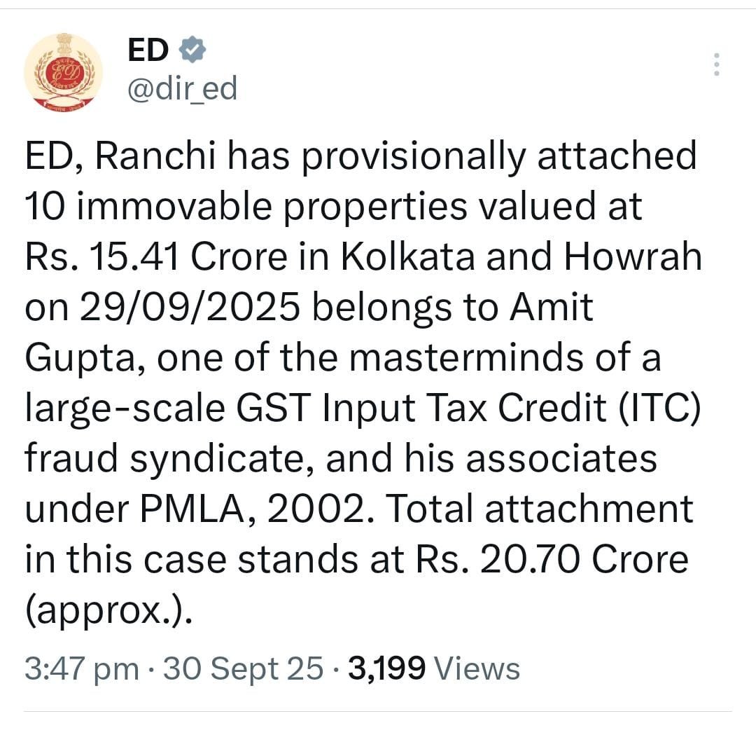 रांचीः झारखंड में जीएसटी घोटालेे को लेकर ईडी ने कार्रवाई तेज कर दी है। ईडी के रांची क्षेत्रीय कार्यालय ने धन शोधन निवारण अधिनियम (पीएमएलए), 2002 के प्रावधानों के तहत कोलकाता और हावड़ा में 15.41 करोड़ रुपये मूल्य की 10 अचल संपत्तियों को अस्थायी रूप से कुर्क किया है।