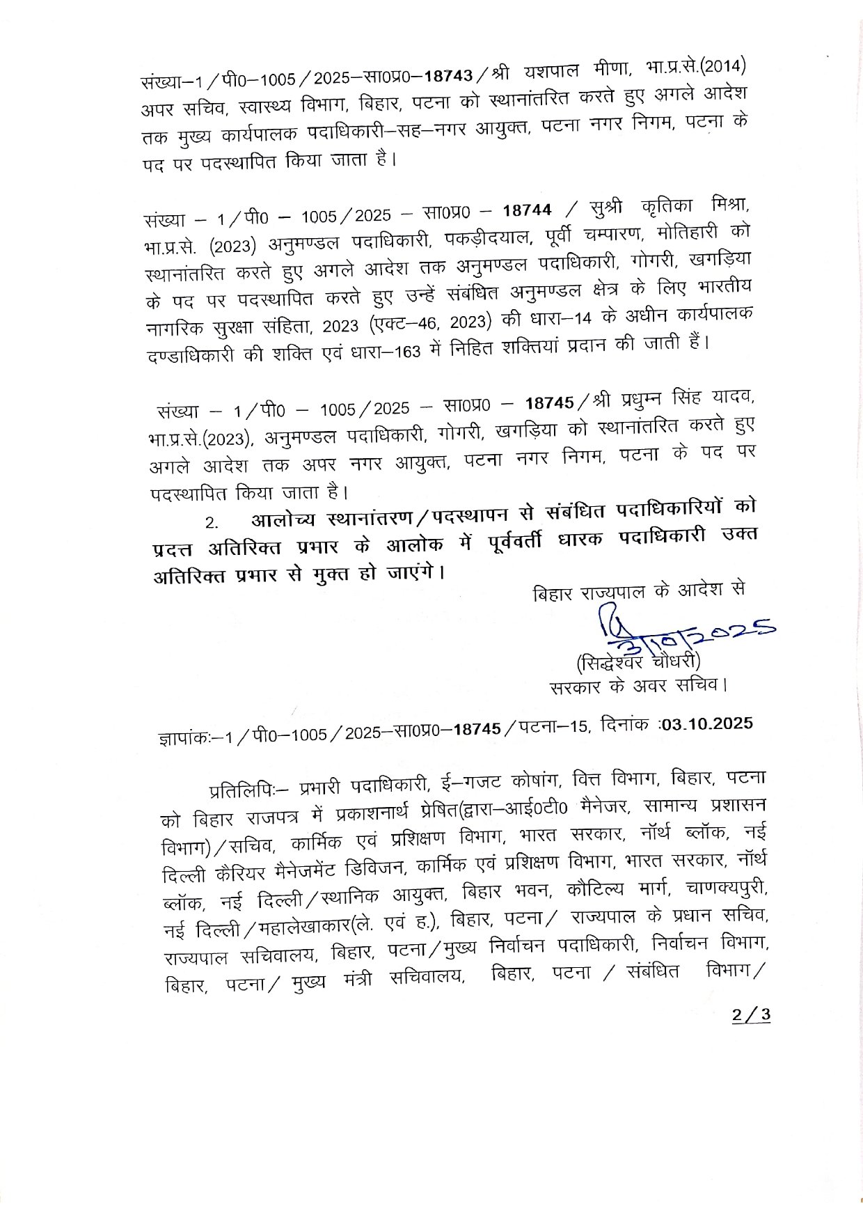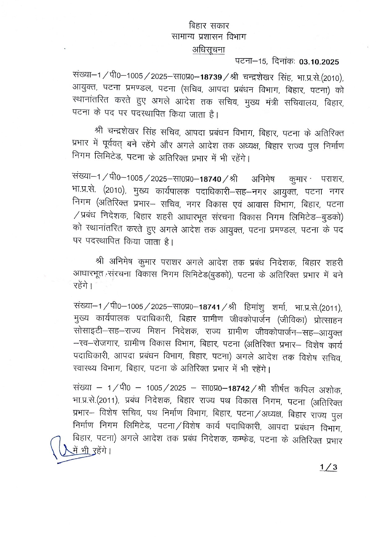 शुक्रवार को किये गए प्रशासनिक फेरबदल में वरिष्ठ आईएएस अधिकारी चंद्रशेखऱ सिंह को मुख्यमंत्री सचिवालय का सचिव बनाया गया है जबकि पटना प्रमंडल के नए कमिश्नर के पद पर अनिमेष कुमार परासर को नियुक्त किया है वहीं IAS यशपाल मीणा को नगर आयुक्त पटना बनाया गया है।