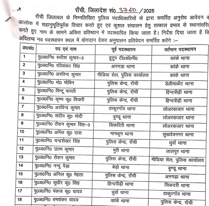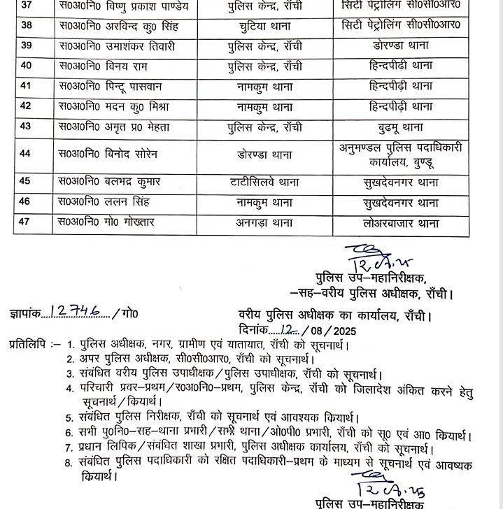15 अगस्त से पहले रांची में बड़ा प्रशासनिक फेरबदल, DIG ने बड़े पैमाने पर पुलिस पदाधिकारियों का किया तबादला