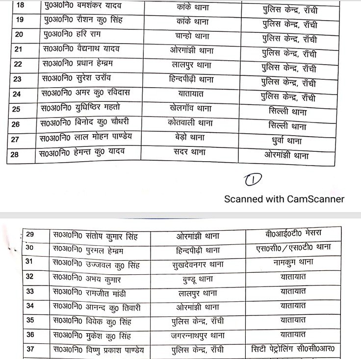 रांची में बड़े पैमाने पर पुलिस पदाधिकारियों के तबादले, कई थानों के प्रभारी बदले गए