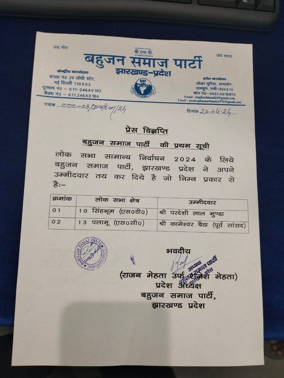 बसपा ने पलामू की सीट पर पूर्व माओवादी कमांडर और पलामू से सांसद रहे कामेश्वर बैठा को उम्मीदवार बनाया है। कामेश्वर बैठा ने शुक्रवार को ही आरजेडी से इस्तीफा देकर बहुजन समाज पार्टी की सदस्यता ली थी। बैठा 2009 में पलामू सीट से जेएमएम के टिकट पर चुनाव जीतकर संसद जा चुके है। कामेश्वर बैठा पहले ऐसे नेता है जो माओवादी के टॉप कमांडर रहने के बाद लोकसभा के भी सदस्य रहे। पलामू सीट पर उनका मुकाबला राज्य के पूर्व डीजीपी रह चुके है, दो बार से पलामू सीट से बीजेपी के सांसद बीडी राम से है। यहां से आरजेडी ने ममता भुईयां को चुनाव मैदान में उतारा है। वही सिंहभूम सीट से बसपा ने परदेशी लाल मुंडा को एक बार फिर चुनाव मैदान में उतारा है। 2019 के चुनाव में भी उन्हे बसपा ने टिकट दिया था लेकिन वो गीता कोड़ा से चुनाव हार गये थे। बसपा उन्हे मनोहरपुर विधानसभा सीट से भी उम्मीदवार बना चुकी है लेकिन वहां भी उन्हे भारी मतों से हार का सामना करना पड़ा था। सिंहभूम सीट पर परदेशी लाल मुंडा का मुकाबला बीजेपी उम्मीदवार गीता कोड़ा और जेएमएम उम्मीदवार जोबा मांझी से होगा।