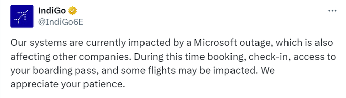 इंडिगो ने ट्वीट किया, “हमारे सिस्टम वर्तमान में माइक्रोसॉफ्ट आउटेज से प्रभावित हैं, जिसका असर अन्य कंपनियों पर भी पड़ रहा है। इस दौरान बुकिंग, चेक-इन, आपके बोर्डिंग पास तक पहुंच और कुछ उड़ानें प्रभावित हो सकती हैं…”