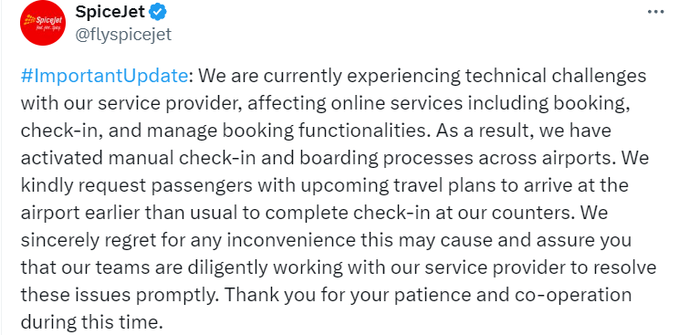 स्पाइसजेट ने ट्वीट किया, “हम वर्तमान में अपने सेवा प्रदाता के साथ तकनीकी चुनौतियों का सामना कर रहे हैं, जिससे बुकिंग, चेक-इन और बुकिंग कार्यक्षमताओं सहित ऑनलाइन सेवाएं प्रभावित हो रही हैं। परिणामस्वरूप, हमने हवाई अड्डों पर मैन्युअल चेक-इन और बोर्डिंग प्रक्रियाएं सक्रिय कर दी हैं। हम आगामी यात्रा की योजना बनाने वाले यात्रियों से अनुरोध करते हैं कि वे हमारे काउंटरों पर चेक-इन पूरा करने के लिए सामान्य समय से पहले हवाई अड्डे पर पहुंचें…”