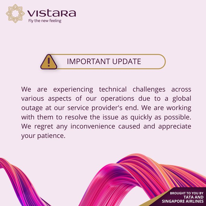 विस्तारा ने ट्वीट किया, “हमारे सेवा प्रदाता की ओर से वैश्विक आउटेज के कारण हम अपने परिचालन के विभिन्न पहलुओं में तकनीकी चुनौतियों का सामना कर रहे हैं। हम इस समस्या को जल्द से जल्द हल करने के लिए उनके साथ काम कर रहे हैं…”