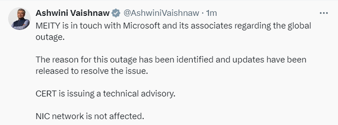 इलेक्ट्रॉनिक्स और सूचना प्रौद्योगिकी मंत्री अश्विनी वैष्णव ने ट्वीट किया, “MEITY वैश्विक आउटेज के संबंध में माइक्रोसॉफ्ट और उसके सहयोगियों के संपर्क में है। इस आउटेज का कारण पहचान लिया गया है और समस्या को हल करने के लिए अपडेट जारी कर दिए गए हैं। CERT एक तकनीकी सलाह जारी कर रहा है। NIC नेटवर्क प्रभावित नहीं है।”