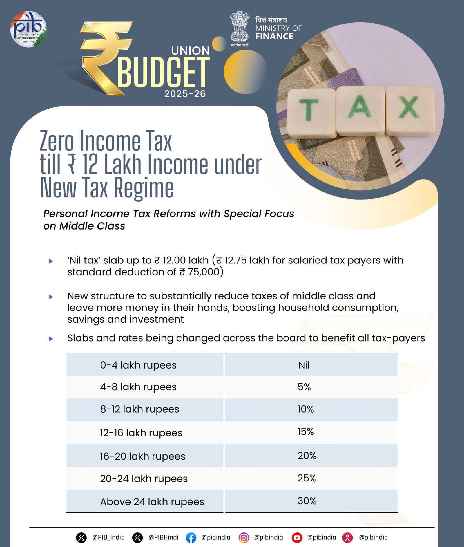 अब 24 लाख की आय पर अब 30 फीसदी टैक्स लगेगा। वहीं 75 हजार रुपये तक के स्टैंडर्ड डिडक्शन की छूट होगी. साथ ही 15-20 लाख की आय पर 20% का टैक्स होगा. वहीं 8-12 लाख की आय पर 10 आयकर होगा।