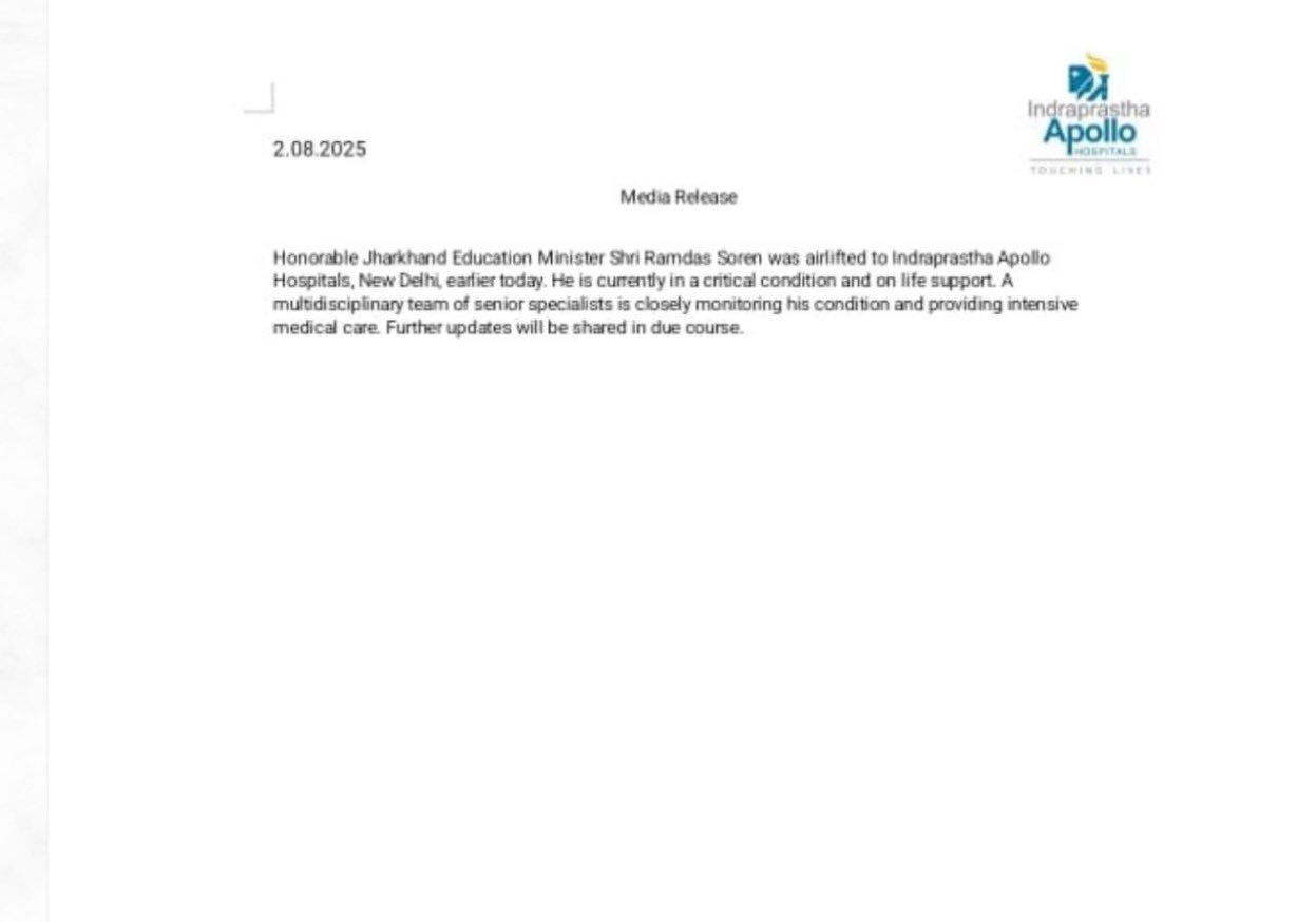 इससे पहले अपोलो ने मेडिकल बुलेटिन जारी कर कहा था कि झारखंड सरकार में मंत्री रामदास सोरेन की स्थिति नाजुक बनीं हुई है। दिल्ली के अपोलो अस्पताल की ओर से रामदास सोरेन को लेकर पहला मेडिकल बुलेटिन जारी किया गया है। मेडिकल बुलेटिन के अनुसार रामदास सोरेन क्रिटिकल बनी हुई है और उन्हे लाइफ सपोर्ट सिस्टम पर रखा गया है।