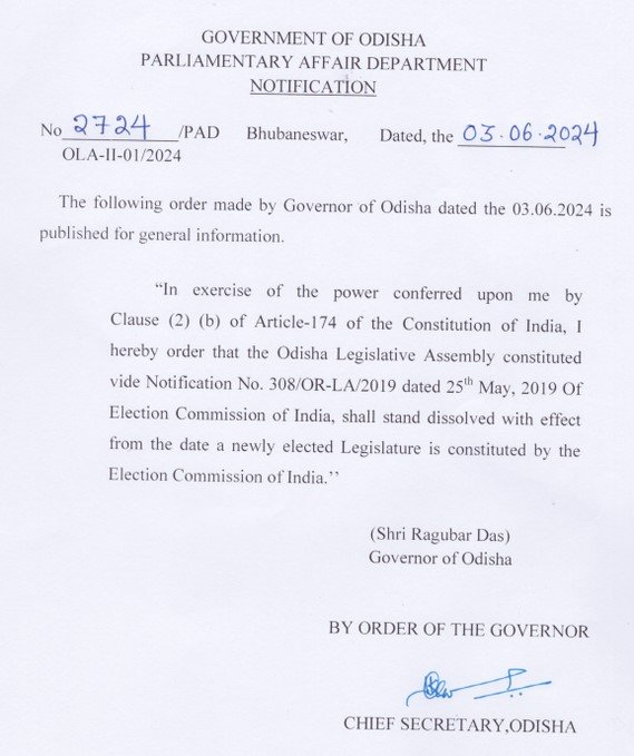 सोमवार को 16वीं विधानसभा भंग करने की सिफारिश कैबिनेट ने राज्यपाल रघुवर दास से की है। राज्यपाल की मंजूरी और अधिसूचना के बाद विधानसभा भंग हो जाएगी। इससे पहले भी 2019 में चुनाव परिणाम आने से पहले नवीन पटनायक ने विधानसभा भंग करने की सिफारिश राज्यपाल से की थी। 147 सदस्यीय ओडिशा विधानसभा में मतदान तीन चरणों में कराया गया था। चुनाव के दौरान मुख्यमंत्री नवीन पटनायक के स्वास्थ्य को लेकर भी कई तरह की खबरें आई। एग्जिट पोल बता रहे है कि इस चुनाव में बीजेडी को नुकसान और बीजेपी को फायदा हो सकता है। दोनों ही पार्टियों के बीच कांटे के मुकाबले में सीटे एक दूसरे के आसपास रह सकती है।राज्यपाल रघुवर दास ने नवीन पटनायक कैबिनेट द्वारा किये गए विधानसभा भंग करने की सिफारिश को स्वीकर कर लिया है।