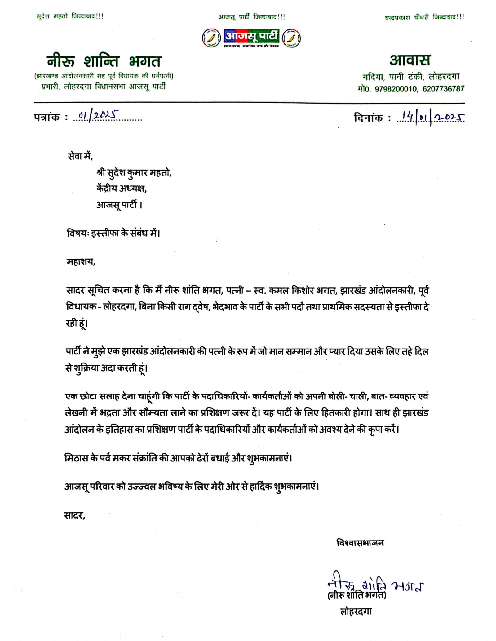 मैं झारखंड आंदोलनकारी, लोहरदगा के पूर्व विधायक कमल किशोर भगत की पत्नी नीरू शांति भगत बिना किसी राग द्वेष, भेदभाव के आजसू पार्टी के सभी पद तथा प्राथमिक सदस्यता से इस्तीफा दे रही हूं। उन्होंने पार्टी सुप्रीमो को भेजे इस्तीफा में यह भी लिखा है कि आजसू पार्टी ने मुझे एक झारखंड आंदोलनकारी की पत्नी के रूप में जो मान सम्मान और प्यार दिया उसके लिए तहे दिल से शुक्रिया अदा करती हूं। पर एक छोटा सलाह भी देना चाहूंगी कि पार्टी के पदाधिकारियों-कार्यकर्ताओं को अपनी बोली-चाली, बात-व्यवहार एवं लेखनी में भद्रता और सौम्यता लाने का प्रशिक्षण जरूर दें। यह आजसू पार्टी के लिए हितकारी होगा। साथ ही झारखंड आंदोलन के इतिहास का प्रशिक्षण पार्टी के पदाधिकारियों और कार्यकर्ताओं को अवश्य देने की कृपा करें। इसके साथ मिठास के पर्व मकर संक्रांति की आपको ढेरों बधाई और शुभकामनाएं। उन्होंने आजसू परिवार के उज्ज्वल भविष्य के लिए भी हार्दिक शुभकामनाएं दी है।