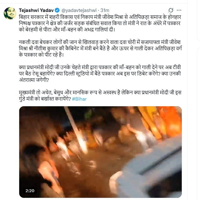 जीवेश कुमार के यूट्यूबर दिवाकर के साथ हुई नोंकझोंक का वीडियो सोशल मीडिया प्लेटफॉर्म एक्स शेयर करते हुए तेजस्वी यादव ने सरकार को घेरते हुए कहा कि बिहार सरकार में शहरी विकास एवं निकाय मंत्री जीवेश मिश्रा से अतिपिछड़ा समाज के होनहार निष्पक्ष पत्रकार ने क्षेत्र की जर्जर सड़क संबंधित सवाल किया तो मंत्री ने रात के अंधेरे में पत्रकार को बेरहमी से पीटा और माँ-बहन की अभद्र गालियां दी।नकली दवा बेचकर लोगों की जान से खिलवाड़ करने वाला दवा चोरी में सजायाफ्ता मंत्री जीवेश मिश्रा श्री नीतीश कुमार की कैबिनेट में मंत्री बने बैठे है और ऊपर से गाली देकर अतिपिछड़ा वर्ग के पत्रकार को पीट रहे है।क्या प्रधानमंत्री मोदी जी उनके चेहते मंत्री द्वारा पत्रकार की माँ-बहन को गाली देने पर अब टीवी पर बैठ टेसू बहायेंगे? क्या दिल्ली स्टूडियो में बैठे पत्रकार अब इस पर डिबेट करेंगे? क्या उनकी अंतरात्मा जगेगी? मुख्यमंत्री तो अचेत, बेसुध और मानसिक रूप से अस्वस्थ है लेकिन क्या प्रधानमंत्री मोदी जी इस गुंडे मंत्री को बर्खास्त करायेंगे?