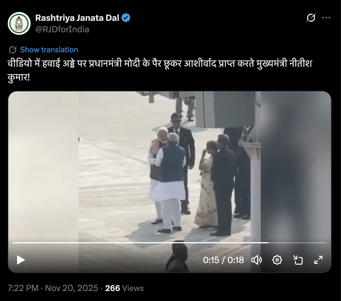 राष्ट्रीय जनता जल (RJD) ने भी पटना एयरपोर्ट का वीडियो एक्स पर साझा किया है। RJD ने लिखा, 'वीडियो में हवाई अड्डे पर प्रधानमंत्री मोदी के पैर छूकर आशीर्वाद प्राप्त करते मुख्यमंत्री नीतीश कुमार!'