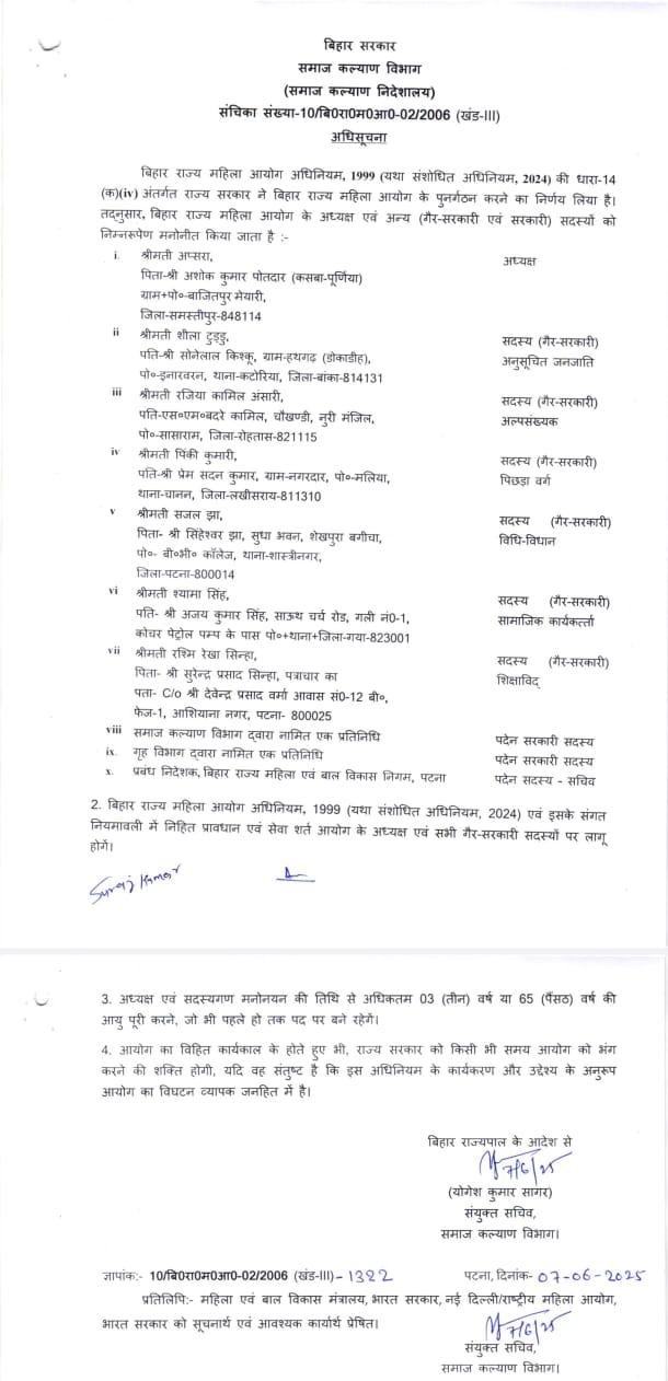 नीतीश कुमार के प्रधान सचिव दीपक कुमार की पत्नी को बनाया गया महिला आयोग का सदस्य, नोटिफिकेशन में किया गया बड़ा खेल