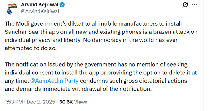 AAP के राष्ट्रीय संयोजक अरविंद केजरीवाल ने कहा, “मोदी सरकार का सभी मोबाइल बनाने वालों को सभी नए और मौजूदा फोन में संचार सारथी ऐप इंस्टॉल करने का आदेश, लोगों की निजता और आज़ादी पर खुला हमला है। दुनिया के किसी भी लोकतंत्र ने ऐसा करने की कोशिश नहीं की है। सरकार द्वारा जाती अधिसूचना में ऐप इंस्टॉल करने के लिए लोगों की सहमति लेने या इसे कभी भी डिलीट करने का विकल्प देने का कोई ज़िक्र नहीं है। आम आदमी पार्टी ऐसे बड़े तानाशाही कामों की निंदा करती है और इस अधिसूचना को तुरंत वापस लेने की मांग करती है।”