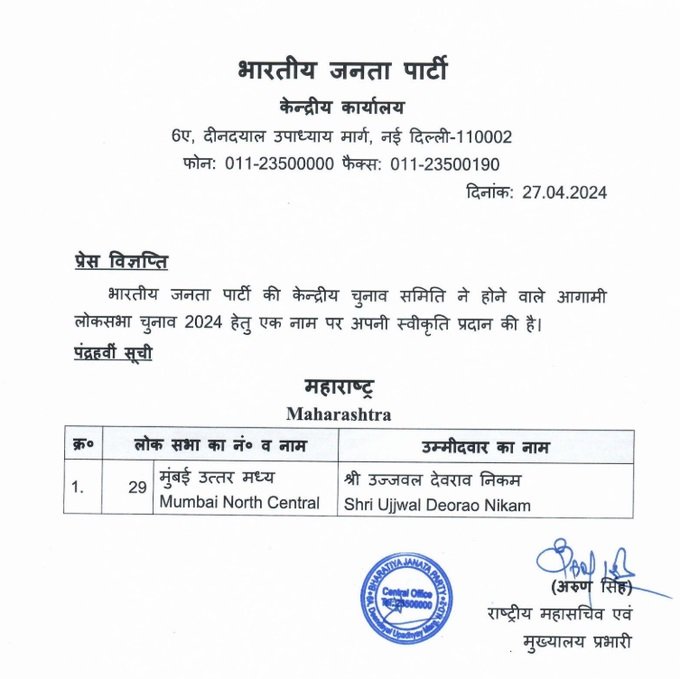 मुंबई: इस वक्त की बड़ी खबर राजनीतिक गलियारे से आ रही है। जहां बीजेपी के दिग्गज नेता रहे प्रमोद महाजन की बेटी पूनम महाजन का बीजेपी ने टिकट काट दिया है। उनकी जगह बीजेपी ने मुंबई उत्तर मध्य सीट से आतंकी कसाब को फांसी दिलवाने वाले वकील उज्जवल निकम को उम्मीदवार बनाया है।