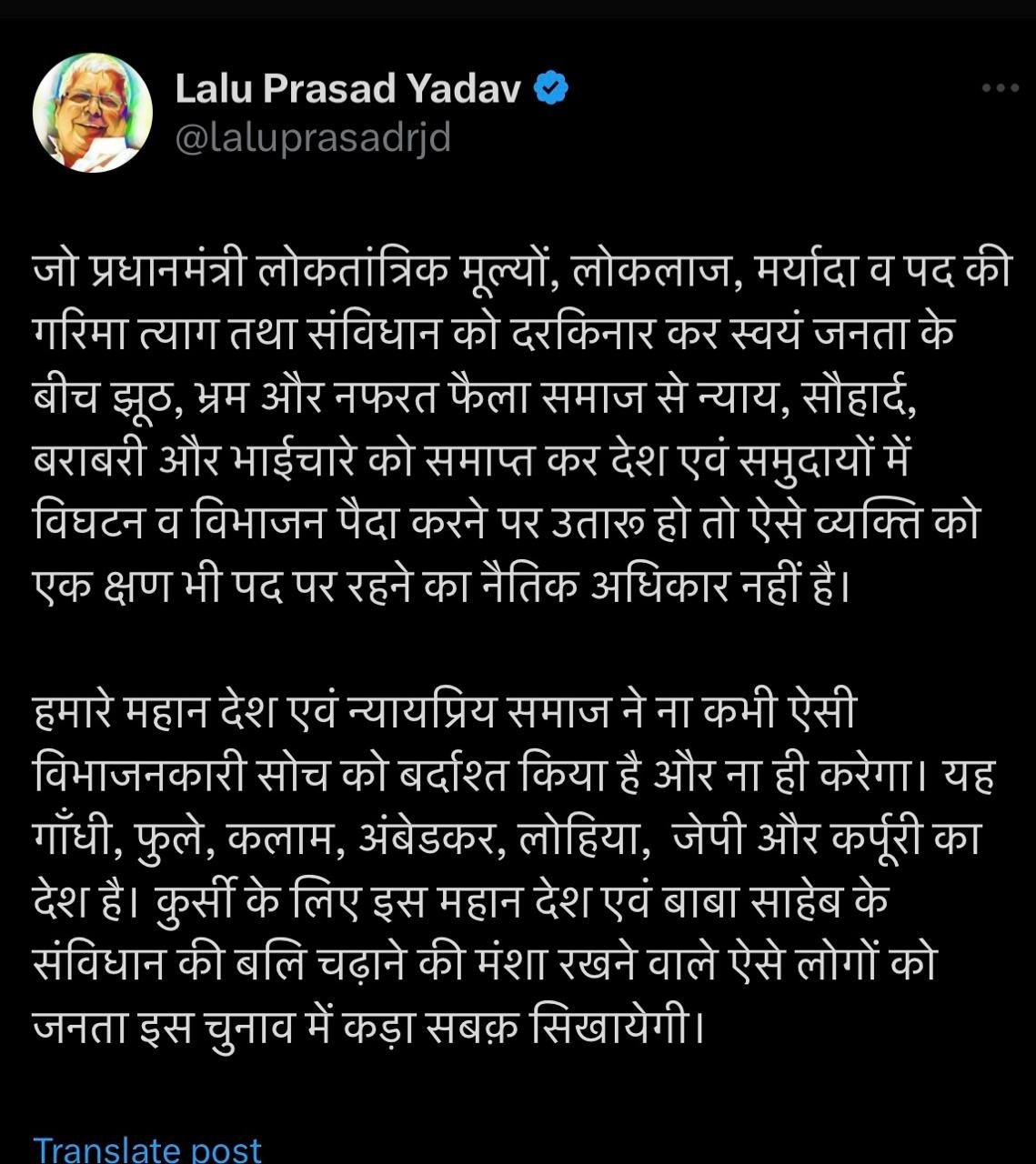 वही आरजेडी अध्यक्ष लालू यादव ने सोशल मीडिया प्लेटफॉर्म एक्स पर पोस्ट करते हुए प्रधानमंत्री मोदी पर जमकर निशाना साधा है। उन्होने लिखा है कि जो प्रधानमंत्री लोकतांत्रिक मूल्यों, लोकलाज, मर्यादा व पद की गरिमा त्याग तथा संविधान को दरकिनार कर स्वयं जनता के बीच झूठ, भ्रम और नफरत फैला समाज से न्याय, सौहार्द, बराबरी और भाईचारे को समाप्त कर देश एवं समुदायों में विघटन व विभाजन पैदा करने पर उतारू हो तो ऐसे व्यक्ति को एक क्षण भी पद पर रहने का नैतिक अधिकार नहीं है।