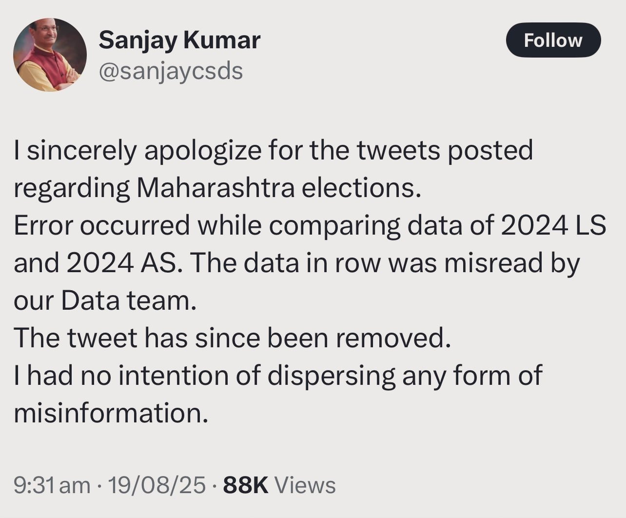 डिलीट किए गए ट्वीट में संजय कुमार ने दावा किया था कि महाराष्ट्र की रामटेक विधानसभा नंबर 59 में लोकसभा चुनाव के वक्त कुल 466203 वोटर थे, जबकि विधानसभा चुनाव के दौरान यह संख्या घटकर केवल 286931 रह गई। ऐसे में दोनों चुनाव के बीच वोटरों की संख्या 38 फीसदी तक कम हो गई।