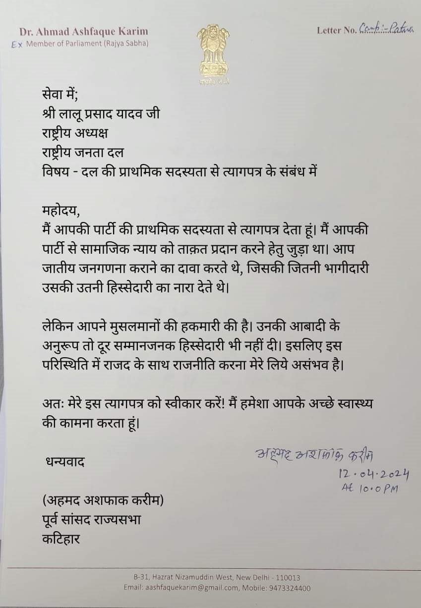 शुक्रवार रात उन्होने आरजेडी अध्यक्ष लालू यादव के नाम पत्र लिखकर पार्टी से इस्तीफा देने की जानकारी दी। उन्होने आरजेडी अध्यक्ष को लिखी गई चिट्टी में लिखा है कि मै आपकी पार्टी के प्राथमिक सदस्यता से त्यागपत्र देता हूं। मै आपकी पार्टी से सामाजिक ताकत प्रदान करने हेतू जुड़ा था। आप जातीय जनगणना कराने का दावा करते थे जिसकी जितनी भागीदारी उसकी उतनी हिस्सेदारी का नारा देते थे। लेकिन आपने मुसलमानों की हकमारी की है। अनके आबादी के अनुरूप तो दूर सम्मानजनक हिस्सेदारी भी नहीं दी। इसलिए इस परिस्थिति में राजद के साथ राजनीति करना मेरे लिए असंभव है। अतः मेरे त्यागपत्र को स्वीकार करें। मै हमेश आपके अच्छे स्वास्थ की कामना करता हूं।