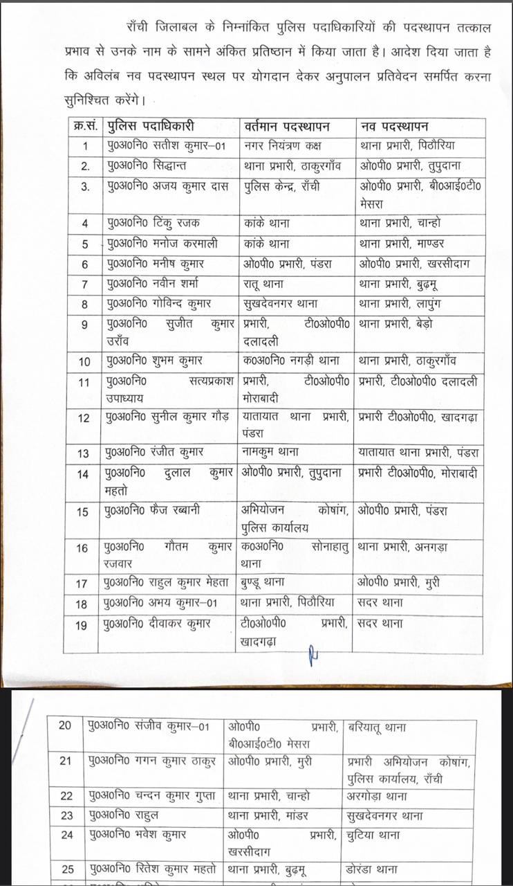 रांचीः राजधानी रांची में बड़े पैमाने पर पुलिस पदाधिकारियों के तबादले किये गए है। कई थानों के प्रभारियों को भी बदला गया है।