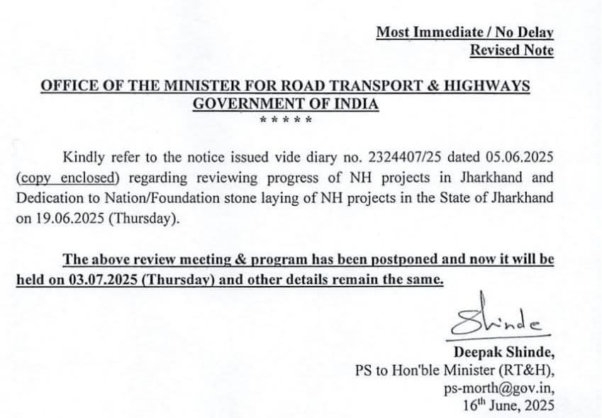 रांचीः राजधानी के रातू रोड़ एलिवेटेड कॉरिडोर के उद्घाटन की तारीख अब बदल गई है। 19 जून को केंद्रीय परिवहन एवं राजमार्ग मंत्री नितिन गडकरी अब इसका उद्घाटन नहीं करेंगे। केंद्रीय रक्षा राज्य मंत्री संजय सेठ ने अपने सोशल मीडिया अकाउंट एक्स पर इसको लेकर जानकारी दी।