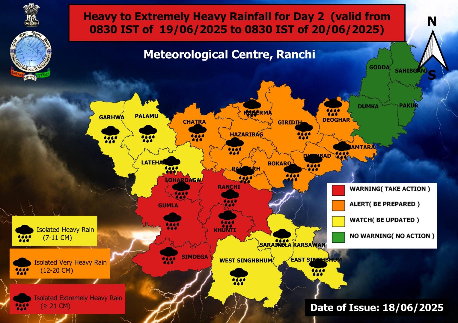 19 जून को भारी बारिश को लेकर राज्य के 9 जिलों में अलर्ट घोषित किया गया है। रामगढ़, हजारीबाग, चतरा, बोकारो, कोडरमा, गिरिडीह, धनबाद, देवघर और जामताड़ा में भारी बारिश को लेकर अलर्ट घोषित किया गया है। रांची, खूंटी समेत कई जिलों में प्रशासन ने बारिश को लेकर स्कूलों को बंद करने का आदेश दिया है। मौसम विभाग ने 20 जून को भी कई जिलों में बारिश का अलर्ट दिया है।