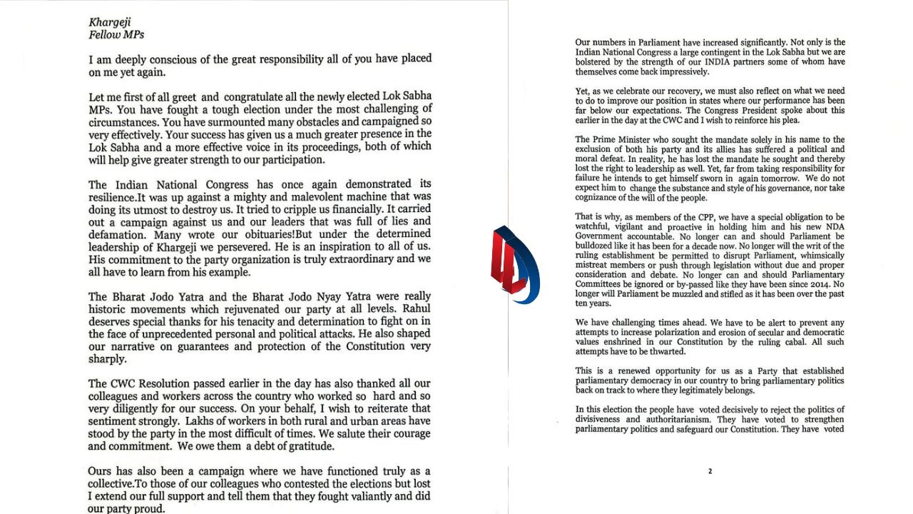 इससे पहले सीडब्लू सी की बैठक में राहुल गांधी को लोकसभा में नेता प्रतिपक्ष बनाने का प्रस्ताव पारित किया। अपने सांसदों की मांग पर राहुल गांधी ने इस प्रस्ताव पर विचार करने के लिए कुछ समय मांगा है। कांग्रेस नेता राजीव शुक्ला ने कहा, “सोनिया गांधी को सर्वसम्मिति से कांग्रेस संसदीय दल (CPP) चेयरपर्सन के रूप में चुना गया है और उन्होंने इस पद को स्वीकार कर लिया है। विपक्ष के नेता को लेकर राहुल गांधी बताएंगे। आज की बैठक CPP को लेकर थी।”