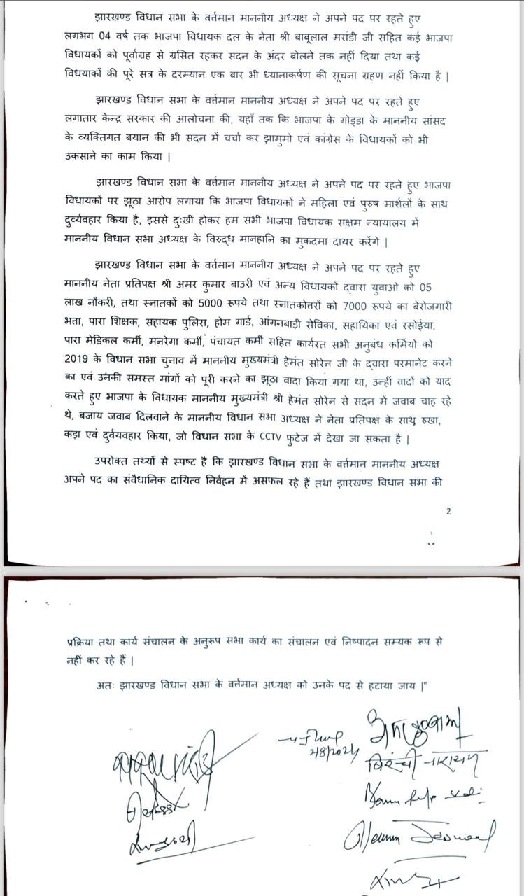 विधानसभा अध्यक्ष पर भेदभावपूर्ण रवैया अपनाने का आरोप लगाया गया है। सदन के अंदर बाबूलाल मरांडी सहित बीजेपी के बड़े नेताओं को सदन में बोलने का मौका नहीं दिये जाने सहित कई आरोप लगाये गए है। बीजेपी के नेता पिछले तीन दिनों से सदन में मुख्यमंत्री के बयान देने की मांग कर रहे है। 2019 में किये गये वादा को पूरा नहीं करने का आरोप बीजेपी के विधायक मुख्यमंत्री पर लगा रहे है।