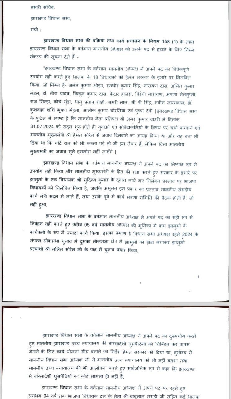 रांची: बीजेपी के विधायकों ने विधानसभा के अध्यक्ष रविंद्रनाथ महतो को पद से हटाने को लेकर विधानसभा सचिव को संकल्प सूचना दी है। बीजेपी के 18 विधायकों ने निलंबन के अगले दिन स्पीकर को हटाने के लिए पत्र लिखा है।