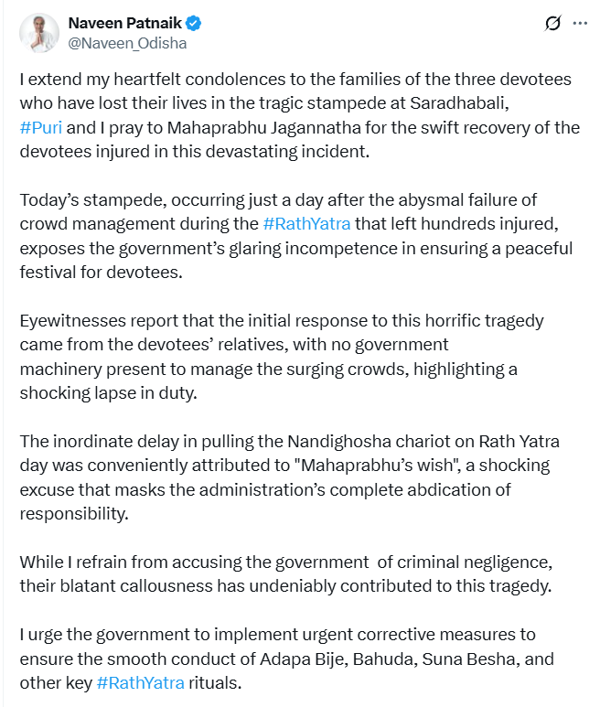 ओडिशा के पूर्व मुख्यमंत्री और LoP नवीन पटनायक ने ट्वीट किया, “मैं पुरी के सारधाबली में हुई दुखद भगदड़ में अपनी जान गंवाने वाले तीन भक्तों के परिवारों के प्रति अपनी हार्दिक संवेदना व्यक्त करता हूं और इस विनाशकारी घटना में घायल हुए भक्तों के शीघ्र स्वस्थ होने के लिए महाप्रभु जगन्नाथ से प्रार्थना करता हूं। आज की भगदड़, रथ यात्रा के दौरान भीड़ प्रबंधन की घोर विफलता के ठीक एक दिन बाद हुई है जिसमें सैकड़ों लोग घायल हो गए थे, यह भक्तों के लिए एक शांतिपूर्ण उत्सव सुनिश्चित करने में सरकार की स्पष्ट अक्षमता को उजागर करता है…”