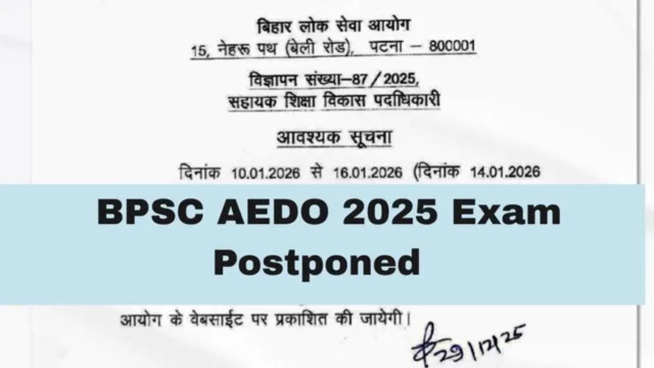 बता दें कि सहायक शिक्षा विकास पदाधिकारी (AEDO) परीक्षा के लिए 9.7 लाख आवेदन हुए हैं। परीक्षा 10 से 16 जनवरी तक तीन चरणों में प्रस्तावित थी।