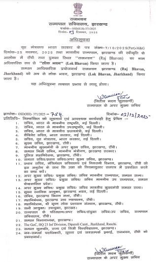झारखंड के राज्यपाल संतोष गंगवार के अपर मुख्य सचिव नितीश मदन कुलकर्णी ने अधिसूचना जारी कर इसे तत्काल प्रभाव से लागू कर दिया है। यह निर्णय केंद्र सरकार की उस नीति का हिस्सा है, जिसमें राज्यपाल आवासों के नाम अधिक जनसरोकार वाले स्वरूप में परिवर्तित किए जा रहे हैं। अधिसूचना लागू होते ही सभी विभागों में पुराने नाम का उपयोग बंद कर दिया गया है।केंद्रीय गृह मंत्रालय ने 25 नवंबर 2025 को यह आदेश जारी किया था। इस कदम के पीछे सरकार की मंशा शासन व्यवस्था को और अधिक जनोन्मुखी तथा लोकतांत्रिक मूल्यों के अनुरूप बनाना है।राज भवन और राज निवास जैसे नाम ब्रिटिश शासनकाल की उस परंपरा से जुड़े हुए थे, जब इन भवनों का उपयोग औपनिवेशिक प्रशासन के शीर्ष पदाधिकारियों के आवास के रूप में किया जाता था।