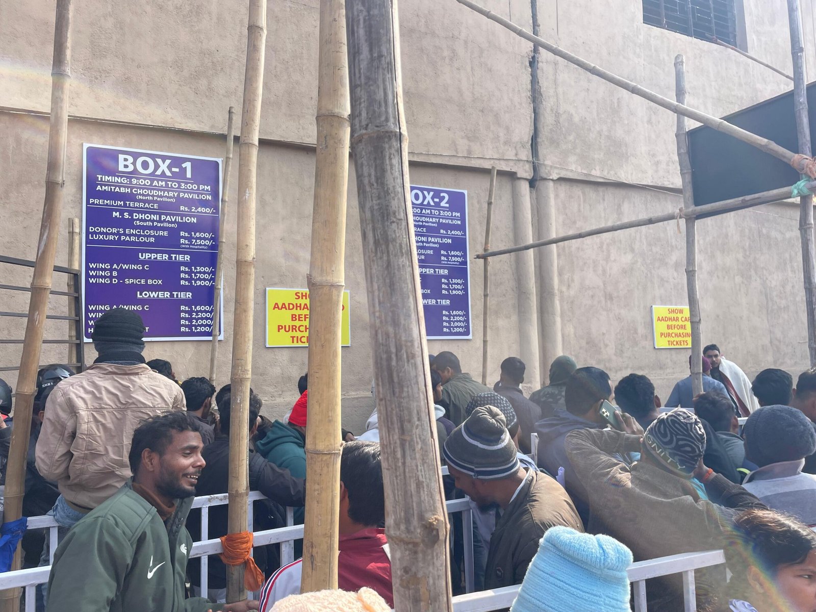 टिकट खरीदने के लिए आधार कार्ड अनिवार्य किया गया है। एक अधिकतम दो टिकट खरीद सकते है। जेएससीए ने महिला दर्शकों के लिए एक अलग काउंटर दिया है जिसमें दिव्यांग भी टिकट ले सकते है। वहीं दो काउंटर ऑनलाइन टिकट बुक कराने वालों को टिकट उपलब्ध कराने के लिए है। शेष तीन काउंटर आम दर्शकोें के लिए रखे गए हैं।
