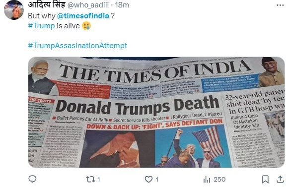 दरअसल रविवार को अमेरिका के पेन्सलविनिया में अमेरिका के पूर्व राष्ट्रपति Donald Trump पर जानलेवा हमला हुआ । एक गनमैन ने उन पर गोली चलाई जो उनके कान को छू कर निकल गई । इस हमले के बाद शूटर को मार गिराया गया । पूरी दुनिया में यह खबर सुर्खियों में है। देश के सबसे बड़े अंग्रेजी अखबार टाइम्स ऑफ इंडिया ने इसी हमले की हेडलाइन दी ‘Donald Trumps Death’ सुबह-सुबह इस हेडलाइन को पढ़ने के बाद पाठकों का दिमाग सुन्न हो गया । कई यूजर्स तो अखबार को ही कोसने लगे कहने लगे ऐसी भूल कैैसे हुई ।