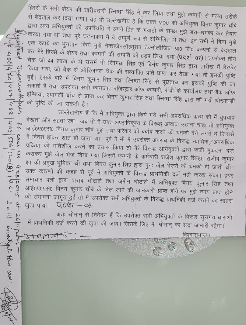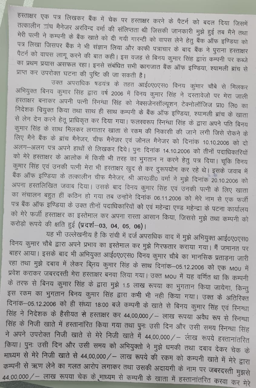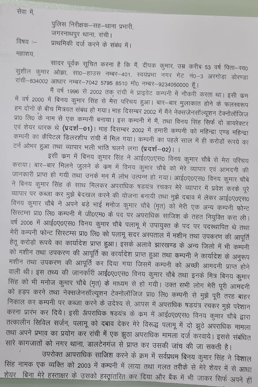 दीपक कुमार ने विनय चौबे के साथ उनकी पत्नी, विनय सिंह समेत कई के खिलाफ मामला दर्ज कराया है। दीपक कुमार ने इनपर आपराधिक षड्यंत्र रचकर व्यापार हड़पने का आरोप लगाने के साथ-साथ फर्जी निकासी कर 40 रुपये हड़पने का आरोप लगाया है।