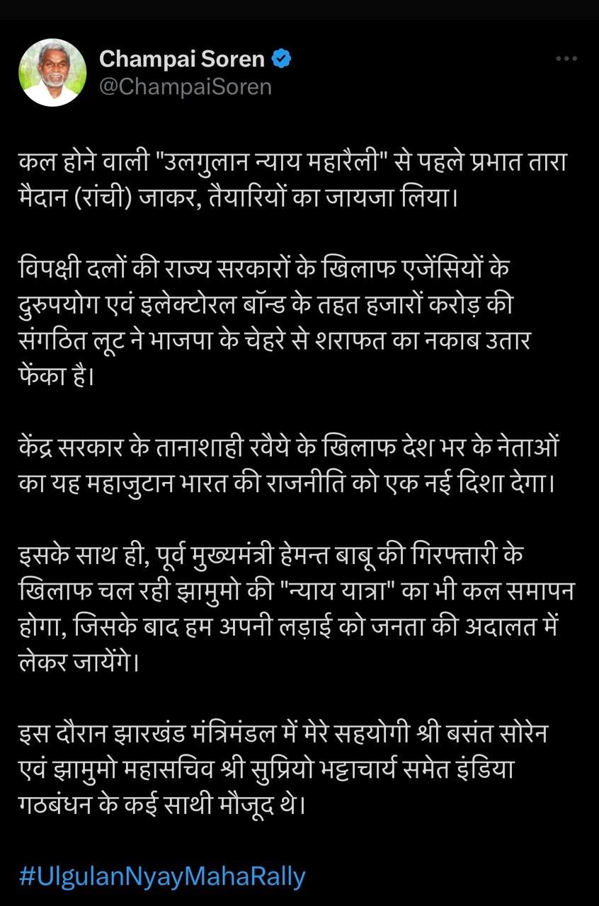 इसके साथ ही, पूर्व मुख्यमंत्री हेमन्त बाबू की गिरफ्तारी के खिलाफ चल रही झामुमो की “न्याय यात्रा” का भी कल समापन होगा, जिसके बाद हम अपनी लड़ाई को जनता की अदालत में लेकर जायेंगे।