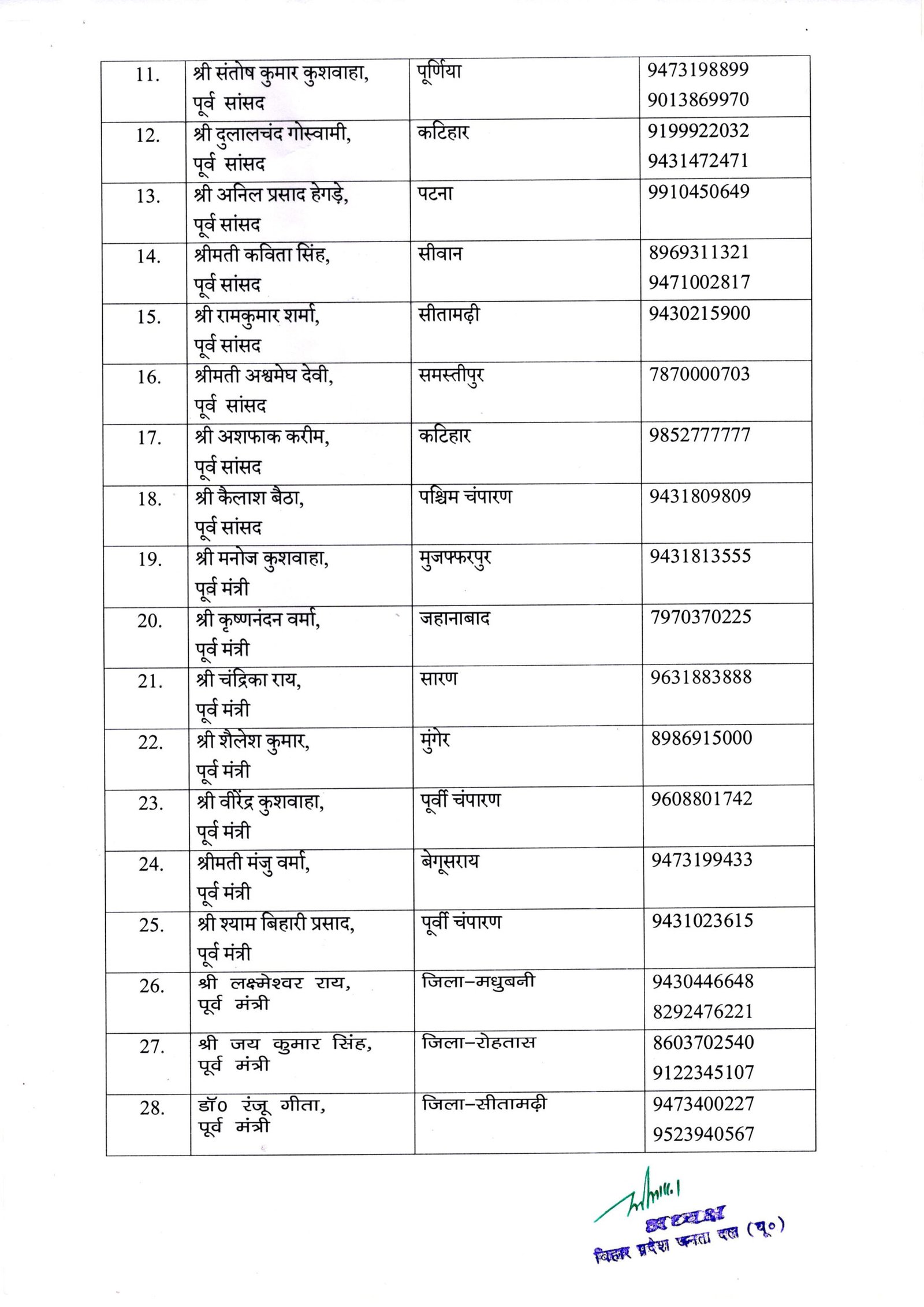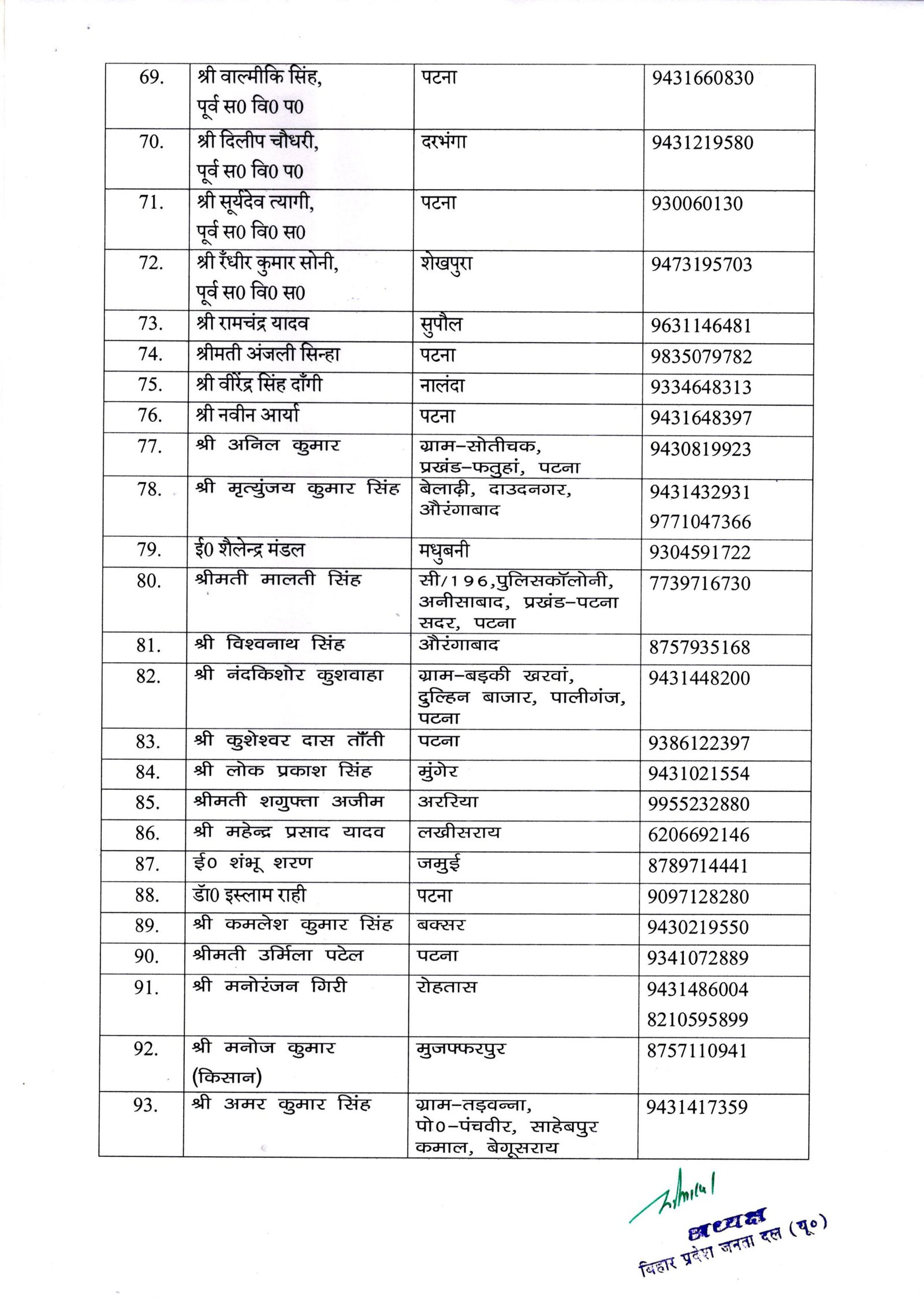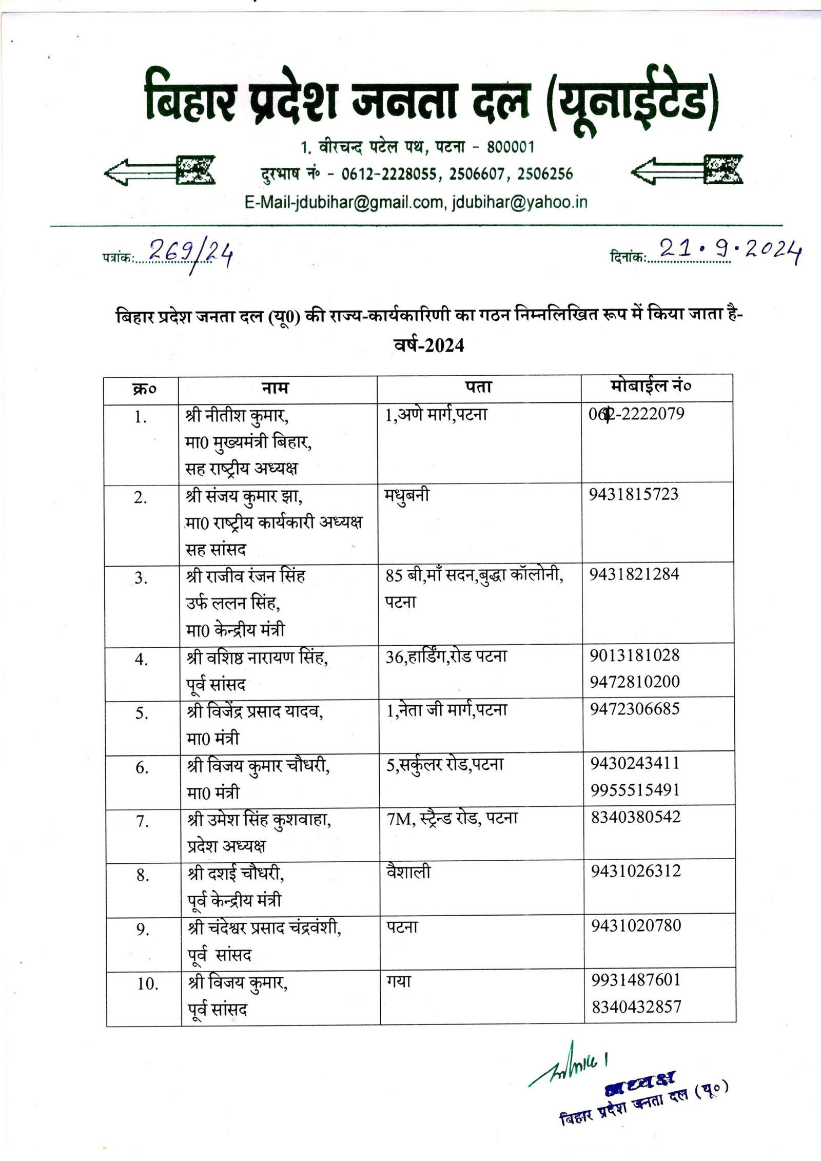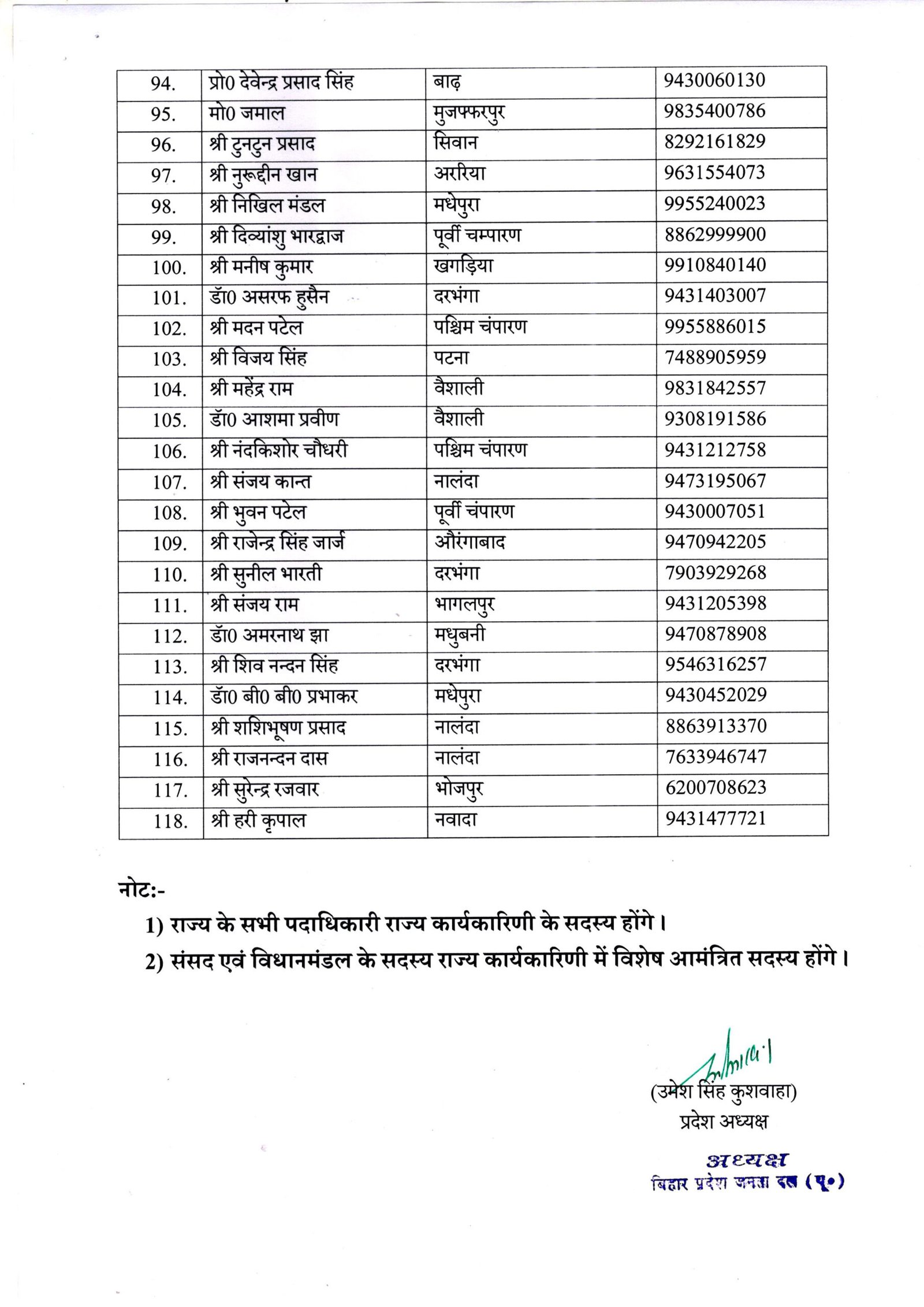 पटना: बिहार में विधानसभा चुनाव से एक साल पहले जेडीयू के प्रदेश अध्यक्ष उमेश कुशवाहा ने राज्य कार्यकारिणी का गठन किया है। कार्यकारिणी में मुख्यमंत्री और राष्ट्रीय अध्यक्ष नीतीश कुमार, कार्यकारी अध्यक्ष संजय झा, केंद्रीय मंत्री और पूर्व राष्ट्रीय अध्यक्ष ललन सिंह को शामिल किया गया है।