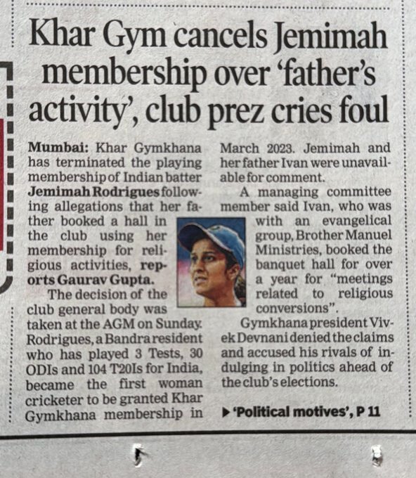 Story that caught the eye: friends in Khar Gymkhana tell me the targeting of Indian cricketer Jemimah Rodrigues is PURE POLITICS. Club elections are just days away, she was removed from membership without being given even a proper hearing or notice. ‘Religious conversion’ was… pic.twitter.com/6LkJzuaBw7